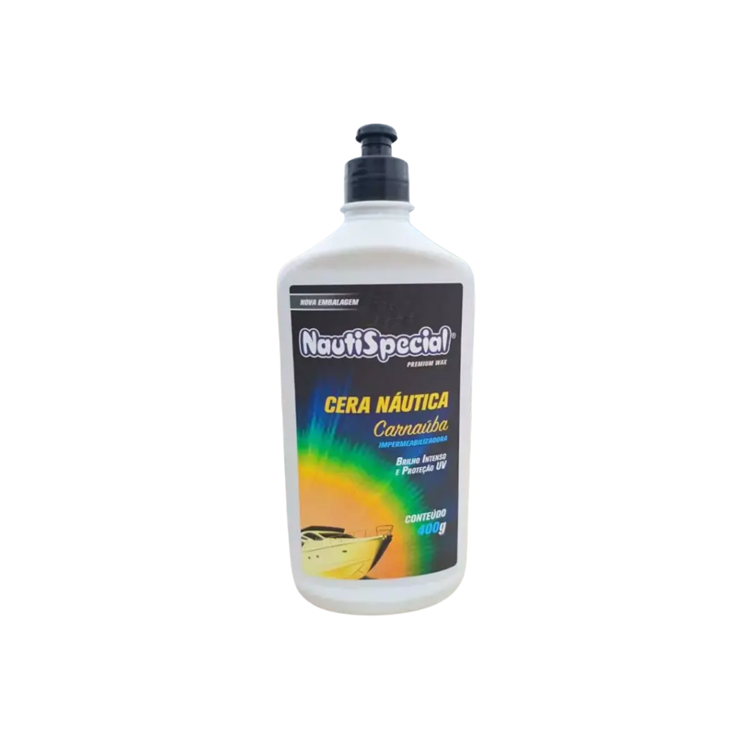 Cera Náutica com 400 gramas possui maior teor de cera de carnaúba, protegendo com maior intensidade todo o casco da embarcação.